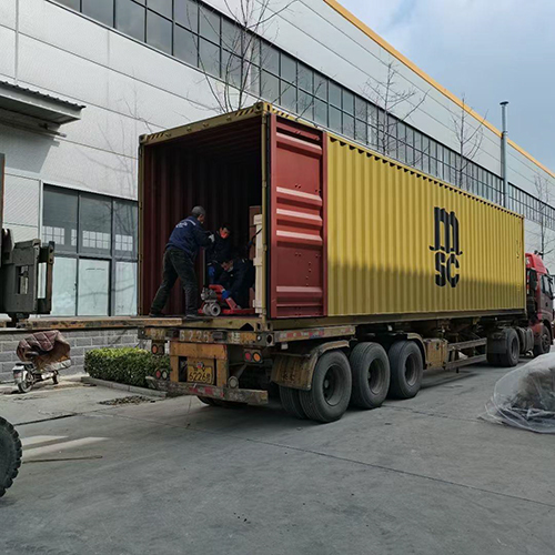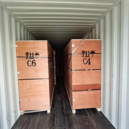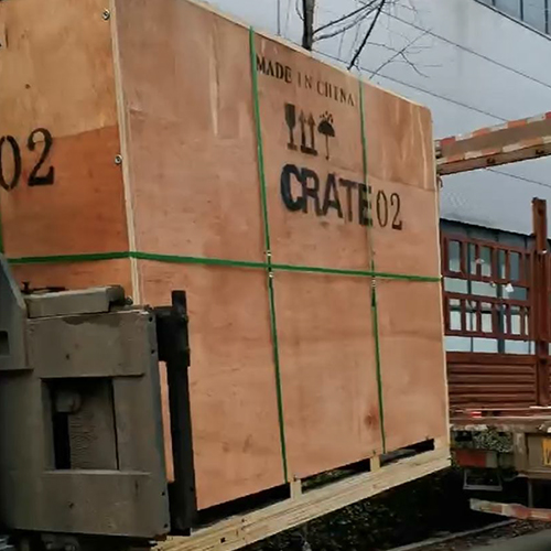 Plastic protective film with cardboard corner protector each window, wood box outside with plastic packing belt. Wood pallet under move by forklift